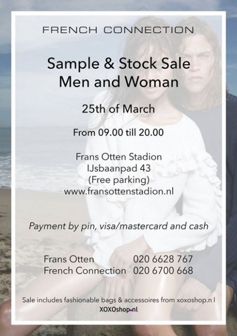 Wat?Stock en Sample sale French Connection. Men and women. Betalen kan met pin, visa/mastercard of cash. Naast French Connection items vind je op deze sale ook bags en accessories van xoxoshop.nl.