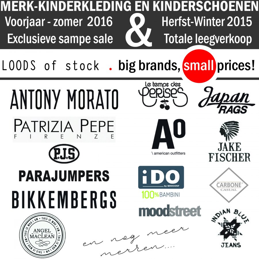 Exclusieve kids merken sample sale spring-summer 2016 & totale leegverkoop samples & stock winter 2015. Tijdens deze eenmalige verkoop worden de nieuwste voorjaar en zomer samples 2016 aangeboden van zeer exclusieve merken en is er tevens een totale leegverkoop van de volledige winter 2015 kindercollectie!