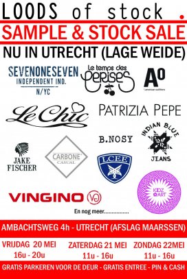 LOODS of stock . organiseert Sample & Stock sales vanuit de winkel in Amsterdam, vanuit haar loods in Utrecht en op verschillende Pop-Up locaties in het land. Meld je aan op http://www.loodsofstock.com/inschrijven/ dan blijf je op de hoogte en ontvang je voortaan uitnodigingen per email.