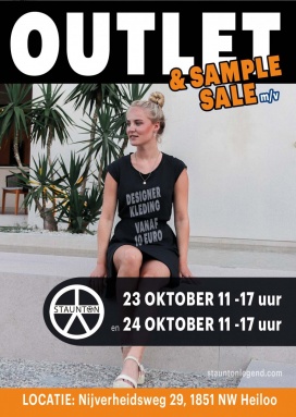 Luxury Travel brand Staunton Legend organiseert eenmalig op 23 en 24 oktober a.s. voor het eerst een exclusieve outlet en sample sale! Dames en heren kleding waarvan sommige producten met 100den euro's korting! Dames en heren kleding al vanaf € 10,- . Producten die verkocht worden zijn: Heren: schoenen, jassen, T-shirts, shirts, polo's, broeken, jackets, blazers, sjaals en meer. Dames: Jassen, rokken, dresses, blouses, T-shirts, tops, bottoms, rokken, leggings, handtassen, sjaals en meer. Daarnaast kun je ook luxury cadeau artikelen tegen outlet prijzen kopen! Pinnen mag. Zonder VIP toegang gaan de deuren open vanaf 11:00 uur tot 17:00 uur. VIP's mogen vanaf 9:30 uur naar binnen.