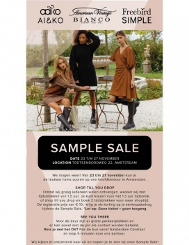 Sample sale van kleding van de merken Aaiko, Freebird, American Vintage, Simple, AI&KO girls (maat 152) en Bianco. Kortingen tot -70%.