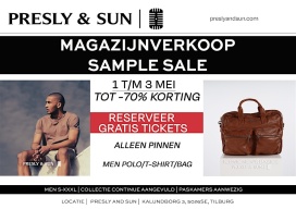 Wat?Sample sale / magazijnverkoop georganiseerd door Presly & Sun. Je shopt hier heren polo's, t-shirts en heren tassen aan kortingen tot -70%.