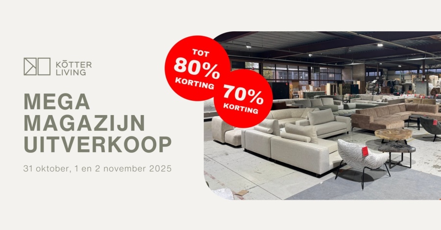 Magazijn uitverkoop georganiseerd door Kötter Living. Je shopt hier meubelen van tafels tot banken, stoelen en accessoires. Kortingen tot -80%